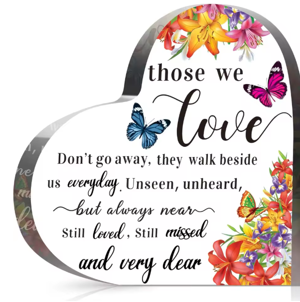 This elegantly designed, heart-shaped acrylic memorial plaque features vibrant butterflies and lilies, surrounding the tender and timeless inscription: "those we love Don't go away, they walk beside us everyday. Unseen, unheard, but always near, still loved, still missed and very dear."